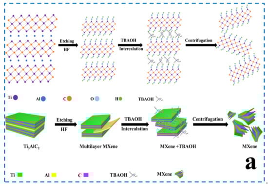 Initially, the MAX-phase Ti3AlC2 was dispersed into a 20 mL 40% aqueous HF [35] solution in a Teflon bottle and stirred for 30 min to form a homogenous solution. Subsequently, 1 g of Ti3AlC2 powder was slowly added to a Teflon bottle over 30 min. It is worth noting that adding the MAX-phase too fast may cause sputtering of the HF aqueous solution because a large amount of hydrogen gas and heat could be generated. The reaction was performed in an oil bath at 35 °C for 24 h. Subsequently, the Al atomic layer was selectively etched after 24 h. To remove excess HF, the solution was washed with deionized water by centrifugation until a neutral supernatant solution was obtained. The product (Ti3C2) was collected by centrifugation at 3500 rpm for 30 min and freeze-dried for two days. One gram of the collected precipitate was exfoliated using 24 mL 25% TBAOH at 25 °C for 4 h. The products thus obtained were purified with ethanol and water several times for the removal of excess TBAOH. Pure MXene was obtained by centrifugation at 3500 rpm for 30 min, and the high-concentration supernatant was collected for future use. The procedure for the preparation of Ti3C2 is shown in Figure 1a.