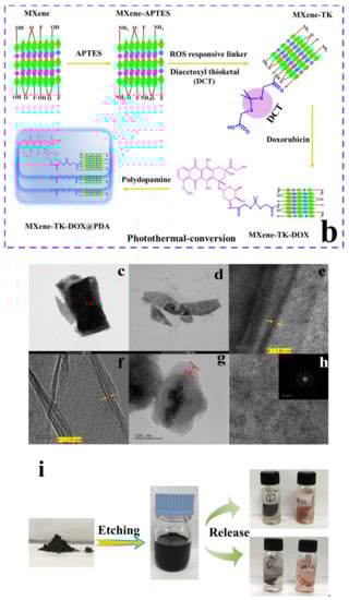 - Liu, G.; Zou, J.; Tang, Q.; Yang, X.; Zhang, Y.; Zhang, Q.; Huang, W.; Chen, P.; Shao, J.; Dong, X. Surface Modified Ti3C2 MXene Nanosheets For Tumor Targeting Photothermal/Photodynamic/Chemo Synergistic Therapy. ACS Appl. Mater. Interfaces 2017, 9, 40077–40086. [Google Scholar] [CrossRef] [PubMed]