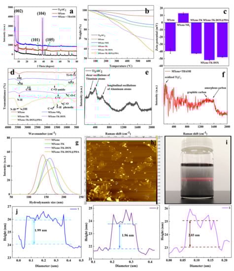 (a) XRD patterns of the Ti3AlC2, MXene, and MXene + TBAOH nanoparticles. (b) TGA curves of the Ti3AlC2, MXene, MXene−NH2, MXene−TK, MXene−TK−DOX, and MXene−TK−DOX @PDA nanoparticles. (c) Zeta potentials of the MXene, MXene-NH2, MXene−TK, MXene−TK−DOX, and MXene−TK−DOX@PDA nanoparticles. (d) FTIR spectra of the MXene, MXene−NH2, MXene−TK, MXene−TK−DOX, and MXene−TK−DOX@PDA nanoparticles. (e,f) Raman spectra of Ti3AlC2 and MXene + TBAOH. (g) Hydrodynamic diameters othe f MXene, MXene−TK, MXene−TK−DOX, and MXene−TK−DOX@PDA nanoparticles. (h,j) Thickness and lateral size of the MXene nanosheets after delamination as measured using AFM. (i) Optical image showing the Tyndall effect of MXene dispersed in an aqueous colloidal solution.