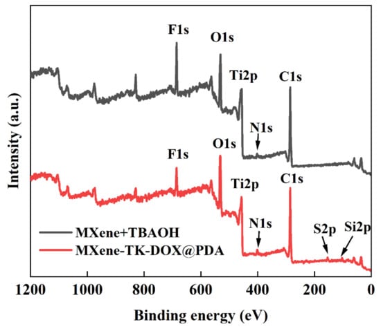 Survey scan spectra of the MXene + TBAOH and MXene−TK−DOX@PDA nanoparticles.