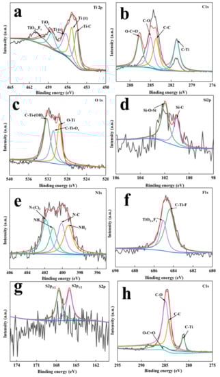XPS spectra of the MXene−TK−DOX@PDA nanoparticles. (a–g) Ti 2p, C 1s, O 1s, Si2p, N1s, F 1s, and S 2p spectra of MXene−TK−DOX@PDA. (h) C 1s XPS spectrum for MXene + TBAOH.