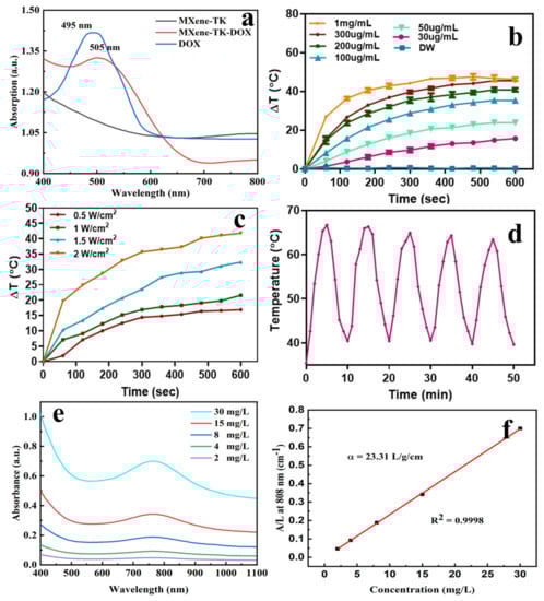 The photothermal conversion efficiency of the MXene-TK-DOX@PDA nanoparticles was further explored at different power densities (increasing from 0.5 to 2.0 W cm−2), as shown in Figure 8c, at a fixed concentration of 300 ug/mL. The ΔT of the MXene-TK-DOX@PDA nanoparticles in an aqueous solution reached 42 °C as the laser power density increased to 2.0 W cm−2, which is sufficient to ablate the cancer cells. To estimate photothermal stability, five heating/cooling cycles were performed for the MXene-TK-DOX@PDA nanoparticles, as depicted in Figure 8d. No apparent temperature decrease was observed after five cycles, demonstrating that the MXene-TK-DOX@PDA nanoparticles have high photothermal stability and can be used as durable photothermal agents for photothermal therapy (PTT). The absorbance spectra of the MXene nanosheets obtained at various concentrations (2, 4, 8, 15, and 30 mg/L) exhibited a distinct absorption peak (Figure 8e) at the first biological window (~808 nm), which is favorable for their application as photothermal agents for PTT [71]. Additionally, the extinction coefficient of the MXene nanosheet was measured based on a linear fit of the MXene concentration (2, 4, 8, 15, and 30 mg/L) and A/L (A denotes the absorbance of MXene at 808 nm, and L denotes path-length = 1 cm) ratio at 808 nm (Figure 8f). Based on the Lambert–Beer law, A/L = αC (where C denotes the concentration of MXene; α denotes the extinction coefficient), the extinction coefficient of MXene was estimated to be 23.31 Lg−1cm−1, which was higher than that of other two-dimensional materials. Liu et al. calculated the extinction coefficient of the Ta4C3-IONP-SPs nanoplatform to be approximately 4 Lg−1cm−1 [72]. Robinson et al. reported that the single-layered nano-reduced graphene oxide (rGO) sheets had an ∼3.6 Lg−1cm−1 in the extinction coefficient [73]. Lin et al. claimed that the extinction coefficient at 808 nm was measured to be 4.06 Lg−1cm−1 of the Ta4C3 nanosheets [74]. Based on these previous works, it can be said that MXene nanosheets show a distinctive advantage as promising photothermal agents for cancer therapy in clinical applications. Notably, the photothermal conversion efficiency of an agent depends on two main parameters: extinction coefficient (ε) and photothermal conversion efficiency (η). The extinction coefficient and photothermal-conversion efficiency reflect the light absorption ability and conversion performance for converting light energy into thermal energy, respectively [75].