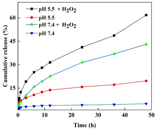 The loading content and encapsulation efficiency of DOX from the MXene-TK-DOX@PDA nanoplatforms were calculated as 13.4% and 27%, respectively, using Equations (1) and (2) with the aid of the calibration curve, as shown in Figure S9. The DOX release percentage of MXene-TK-DOX@PDA nanoparticles in various media was measured using Equation (3) and is shown in Figure 11. A drug release percentage of 5.04% was observed in a mimetic physiological environment (pH of 7.4, PBS) after 48 h; this revealed that the MXene-TK-DOX@PDA nanoparticles could efficiently avoid the unexpected release of DOX during systemic circulation. Furthermore, the percentage of DOX released from the MXene-TK-DOX@PDA nanoparticles remained low in a weakly acidic environment (pH 5.5). This may be because DOX is chemically bonded to the MXene surface [81], effectively avoiding premature release of the drug. It is well-known that thioketals (TK) exhibit ROS-responsive properties. Therefore, the ROS-rupturable behavior of the MXene-TK-DOX@PDA nanoparticles was investigated in H2O2 solutions with different pH (5.5 and 7.4). At pH 7.4, the cumulative DOX release percentage from the MXene-TK-DOX@PDA nanoparticles was 43.07% in the presence of H2O2 for 48 h, which indicated the cleavage of thioketal and the release of DOX. We not only investigated the drug release rate under physiological conditions (pH 7.4), but also studied the DOX release properties in the tumor microenvironment (pH 5.5). As expected, the MXene-TK-DOX@PDA nanoparticles showed a higher drug release percentage (61.8%) in H2O2 solution at pH 5.5 after 48 h of incubation. This is attributable to the thioketal easily cleaving to the H2O2 environment [23] and the possibly higher solubility of DOX in a weak acid solution compared with under neutral conditions [39]. The results of the release performance of the MXene-TK-DOX@PDA nanoparticles revealed that the nanosized vector could control the release of a drug and exhibited good ROS-responsive and pH-responsive behavior.