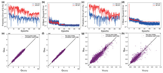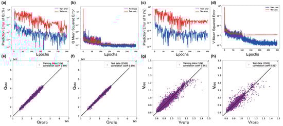 Learning curves and training results for POViT when ABS is used as the activation function. The four plots on the left ((a): prediction error, (b): MSE, (e,f): correlation coefficients) are for Q, while the four on the right ((c): prediction error, (d): MSE, (g,h): correlation coefficients) are for V. is the predicted correlation coefficient, while is the target correlation coefficient. Similarly, and are the predicted and target correlation coefficient, respectively.