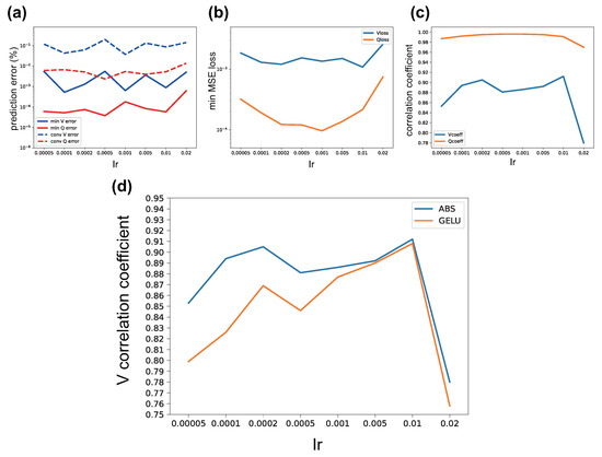 The relationships between learning rate () and MSE loss, correlation coefficient, and prediction error of the proposed POViT embedded with ABS activation are analyzed and illustrated in Figure 5a–c and comparison between ABS and GELU represented by is shown in Figure 5d. For each plot, eight different learning rates are chosen and experiment for each learning rate is repeated three times to avoid outliers. Mean values from those three runs are calculated and plotted in Figure 5. In Figure 5c,d, when the learning rate is around , the average reaches a peak of . Another sub-peak appears at where the average . If the learning rate is larger than , performance of POViT will plunge greatly so only one more trial was performed at . We see that in Figure 5c,d, when , there is a valley of values which indicates the model has unluckily been trained to reach the local minimum. In consequence, we avoided using those “bad” in our final model. In Figure 5a, there is a narrow band of between 0.0005 and 0.001 where both Q and V reach minimum prediction errors. In Figure 5b, the average fluctuates with tiny swings between and , and it reaches a global minimum at .
