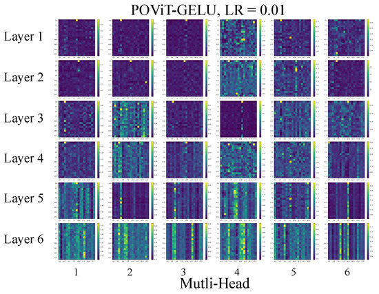 Heatmaps of self-attention in the six-layer POViT model. Learning rate was taken to be 0.01 and GELU was used as the activation function.