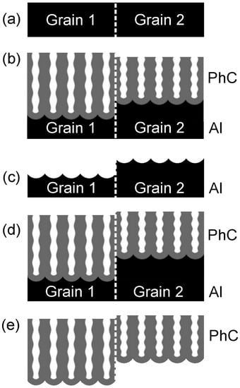 Profilometry of the top and bottom sides of the free-standing 1D PhC was used to measure the height steps on the grain boundaries. Figure 3b shows the height profiles of the surface of the Al substrate after the first anodizing (black) and of the top (red) and bottom (blue) surfaces of the AAO. The profiles were measured along the white line indicated in Figure 2 (see data for sample 30–35). It is worth noting that the samples were not absolutely flat, but a small curvature of the sample surface (ca. 1 µm per mm) did not affect the height steps in the vicinity of grain boundaries. Differences in the electrochemical oxidation rate of Al on grains 1 and 2 caused the appearance of a step on the Al replica with a height of ΔhAl after the first anodizing. During the second anodizig, the charge spent for the oxidation was the same, and thus, the step height increased by a factor of 2, since the electrochemical oxidation rates remained the same. As the Al replica reproduced the bottom surface of an AAO film, the height profiles of the Al replica and the AAO bottom were identical. Indeed, the step height at the bottom of the AAO (Δhb) was about 2ΔhAl. The volume expansion during the anodizing [1] and the difference in the electrochemical oxidation rate led to a decrease in the height of the step observed on the top surface of the AAO (Δht) compared to the height difference in the Al replica after the first anodizing ΔhAl (Figure 3b). The difference in the thickness of the AAO (ΔhAAO) formed on grains 1 and 2 was Δhb − Δht = 1.65 µm. This value is in agreement with the ΔhAAO obtained by the analysis of the Fabry–Pérot optical interference fringes (Figure 3a). The profilometry and analysis of the Fabry–Pérot optical interference fringes support the above-mentioned conclusion that the shift in the λPBG from grain to grain was related solely to the variation in the structure periodicity d. According to the effective medium model [22], the equality of both the rwd (Table S2) and neff (Figure 3a) for the entire sample confirms the equality of both the AAO porosity and the refractive index of the cell walls ncw, i.e., their independence from the Al crystallography.