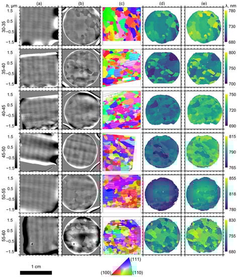 The mosaic of AAO PhCs obtained by anodizing of polycrystalline Al substrates. Height (h) maps of the surface of polycrystalline Al substrates before (a) and after (b) the first anodizing. (c) EBSD maps of the surface of polycrystalline Al substrates. The colours refer to the orientations shown by the inverse pole figure for the normal direction. Maps of the central wavelength (λ) of the photonic band gap (PBG) for (d) dry and (e) wet PhCs. The data in rows correspond to samples 30–35, 35–40, 40–45, 45–50, 50–55, and 55–60. All maps have a lateral size of 12 × 12 mm2. White arrows in the panels (b–d) for the sample 30–35 show the region of interest for detailed study (see Figure 3).