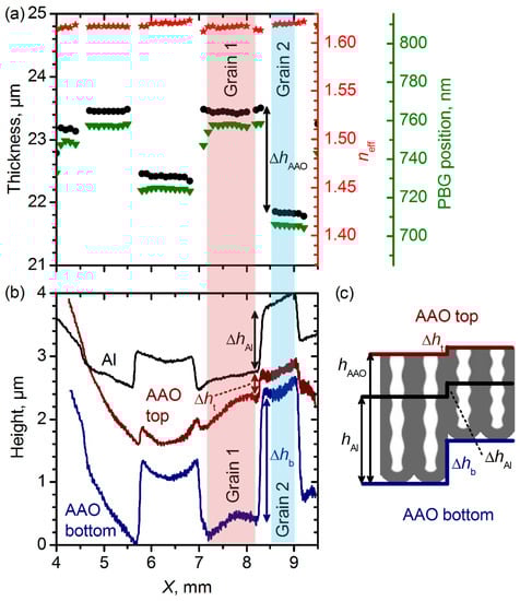 Analysis of the Fabry–Pérot optical interference fringes at different incident angles allows one to measure the neff and film thickness (hAAO) [18,19,20,23]. Figure 3a shows the profiles of hAAO, neff, and λPBG, measured along the white arrow (Figure 2, sample 30–35). The strong variation in the λPBG (green triangles) on the grain boundaries correlates with the strong variation in the hAAO (black circles), whereas the neff (red stars) is almost constant. Taking account of the equal charge Q0 = 0.53 C spent for the formation of each structure period and the number of anodizing cycles of 100, one can conclude that d = hAAO/100. Thus, the shift in the λPBG was related solely to the variation in the d or the AAO growth rate.