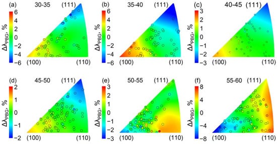 Dependence of the relative shift in the λPBG on the crystallographic orientation of Al substrate in the normal direction for PhCs synthesised at 30–35 V (a), 35–40 V (b), 40–45 V (c), 45–50 V (d), 50–55 V (e), 55–60 V (f). Measurements were performed in air for dry samples. Data points are shown as circles filled with the colour corresponding to the relative deviation from average λPBG and placed on the inverse pole figure in accordance with the crystallographic orientation of the Al grains. The colour map represents the smoothed experimental data for the relative shift of λPBG.