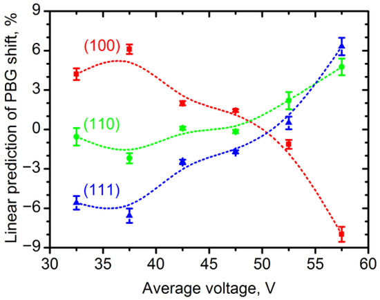 The experimental data on the dependence of the relative shift in the λPBG on the crystallographic orientation were fitted with a plane surface to determine the linear prediction of the relative shift in the λPBG for the low index surfaces of Al (Figure 5). The Uav in the range of 47.5–52.5 V produced more uniform AAO PhCs, whereas the Uav of 37.5 and 57.5 V resulted in high values of the relative PBG shift: the λPBG shifted by up to 10 and 14%, respectively, when the crystallographic orientation of the Al substrate shifted from (111) to (100). In the case of anodizing at 40 V in a 0.3 M C2H2O4 electrolyte with and without the addition of 5% of ethanol, Al(100) has demonstrated 15% [12] and 8% [5] higher growth rates, respectively, of the AAO than Al(111). These data are in good agreement with the linear prediction of the relative shift in the λPBG.
