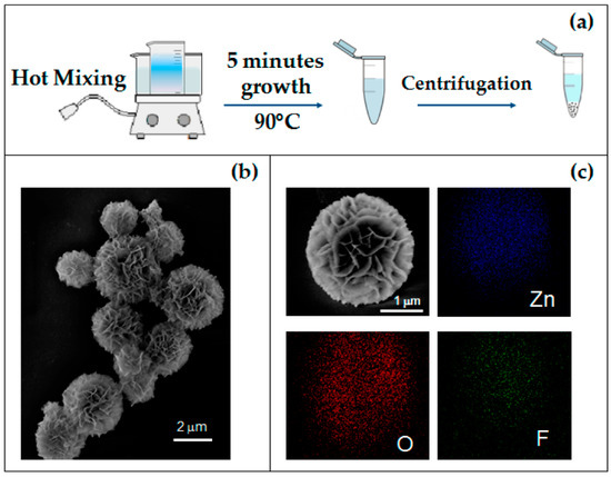 (a) Schematic synthesis diagram of the 3D flower-like hierarchical ZnO microstructures; (b) SEM image of as-grown MFs; (c) SEM image of a single MF and corresponding EDX elemental maps. Adapted from [56].
