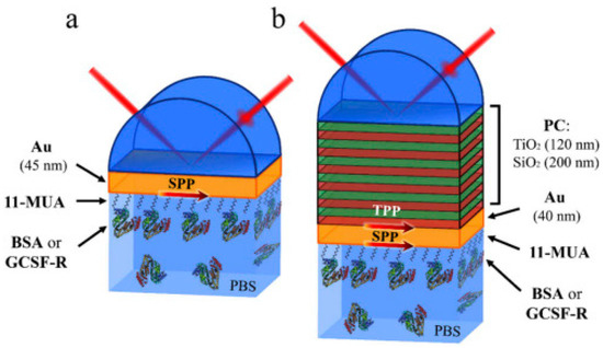 Total internal reflection geometry schematic of the Au (a) and PC/Au (b) samples with a self-assembled monolayer of 11-mercaptoundecanoic acid (11-MUA) and the GCSF-R or BSA protein in phosphate-buffered saline solution. Adopted from [105].