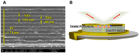 SEM micrograph of the plasmonic photonic structure modified QCM-D sensor chip (A) and Tamm plasmons and cavity mode excitation using nanometer structures of formed photonic crystal (B). Adopted from [106].