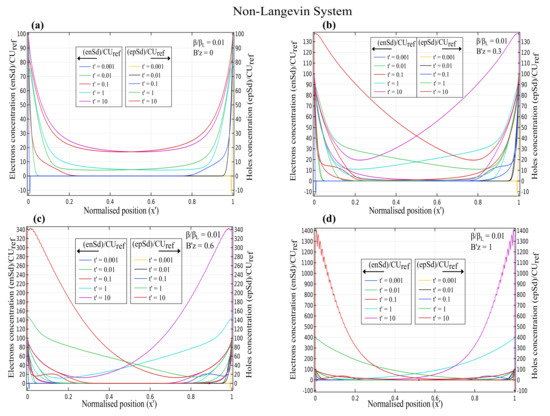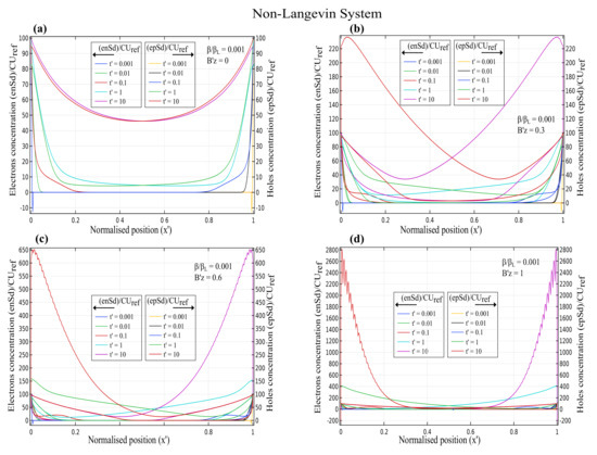 Figure 2 demonstrates that for the non-Langevin system of , the electron and hole concentrations decreased initially with increasing times , 0.01, and 0.1, then increased for times = 1 and 10, and reached maximum values of about 100, 130, 340, and 1400 for magnetic fields of 0, 0.3, 0.6, and 1, respectively. Hence, the charge concentration increased with increasing magnetic fields and times.