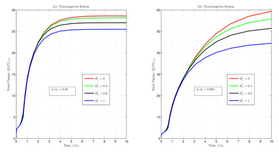 Total charge as a function of normalised time with varying magnetic fields for non-Langevin system with (a) and (b) .