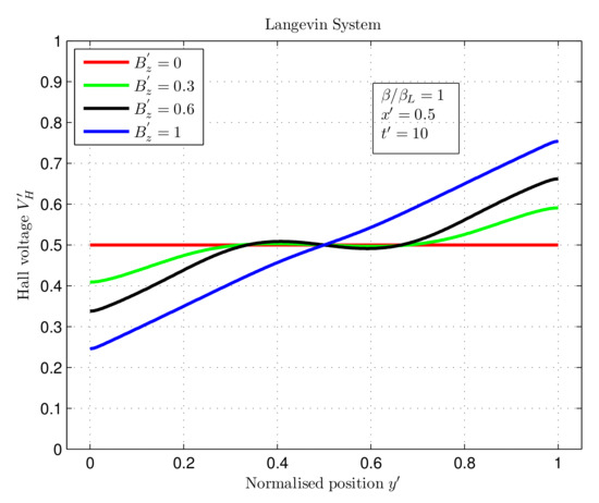 Figure 6 illustrates that for the Langevin system with a magnetic field = 0, the maximum and minimum voltage values were 0.5. Similarly, for magnetic fields of = 0.3, 0.6, and 1, the maximum and minimum voltage values were 0.59 and 0.40, 0.66 and 0.33, and 0.75 and 0.24, respectively. Therefore, the observed potential difference was 0, 0.19, 0.33, and 0.51 for increasing magnetic fields of = 0, 0.3, 0.6, and 1, respectively. Since the normalised equations were employed in the simulations (as discussed in the methods section), the Hall voltage values obtained were also dimensionless. Consequently, the Hall voltage increased with an increasing magnetic field.