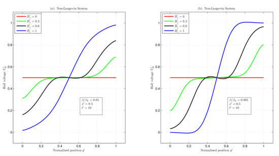Figure 7 depicts the non-Langevin systems with and 0.001. In Figure 7a, with increasing magnetic fields of = 0, 0.3, 0.6 and 1, the maximum voltage values were 0.5, 0.68, 0.83, and 0.98, respectively, and the minimum voltage values were 0.5, 0.31, 0.16, and 0.01, respectively. These values gave potential differences of 0, 0.37, 0.67, and 0.97. Moreover, in Figure 7b, the maximum and minimum voltage values were 0.5 and 0.5, 0.80 and 0.19, 0.96 and 0.03, and 1.00 and , giving potential differences of 0, 0.61, 0.93, and 1 for magnetic fields of = 0, 0.3, 0.6, and 1, respectively. Hence, these results show that increasing the magnetic field increased the Hall voltage.