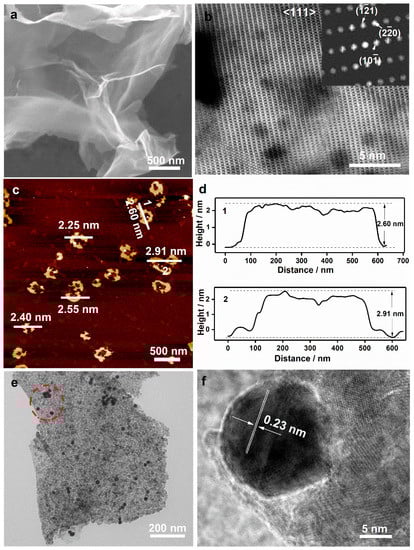(a) SEM and (b) STEM-HAADF images of Co3O4 ultrathin nanosheets; (c) AFM image and (d) the corresponding height profiles of Co3O4 ultrathin nanosheets; and (e) TEM and (f) HRTEM images of Co3O4/Au nanocomposites.