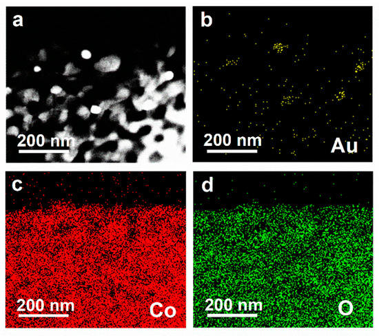 (a) Dark-field STEM micrograph of Co3O4/Au nanocomposites; and STEM-EDS elemental mapping of (b) Au, (c) Co, and (d) O elements.