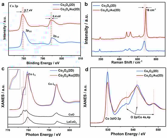 The electronical structure characterizations of Co3O4 ultrathin nanosheets and Co3O4/Au nanocomposites: (a) XPS spectra of Co 2p level; (b) Raman spectra between 100 and 900 cm−1; (c) XANES spectra of Co L-edge in Co3O4 ultrathin nanosheets and Co3O4/Au nanocomposites, and XANES spectra of LaCoO3 and CoO are cited from Ref []; and (d) XANES spectra of O K-edge in Co3O4 ultrathin nanosheets and Co3O4/Au nanocomposites.