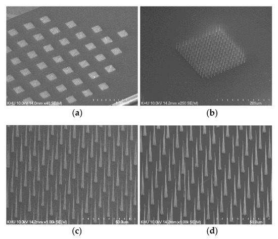 - Park, J.M.; Kim, J.H.; Han, J.S.; Shin, D.S.; Park, S.C.; Son, S.H.; Park, S.J. Fabrication of Tapered Micropillars with High Aspect-Ratio Based on Deep X-Ray Lithography. Materials 2019, 12, 2056. [Google Scholar] [CrossRef]