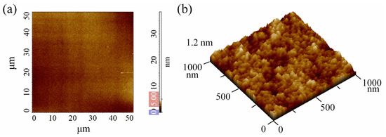 AFM high-resolution images of PMMA surface, acquired on (a) (50 × 50) µm and (b) (1 × 1) µm areas. The pink and blue boxes on the z-scalebar in (a) represent the minimum and maximum adjustment of the colour scale.