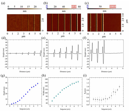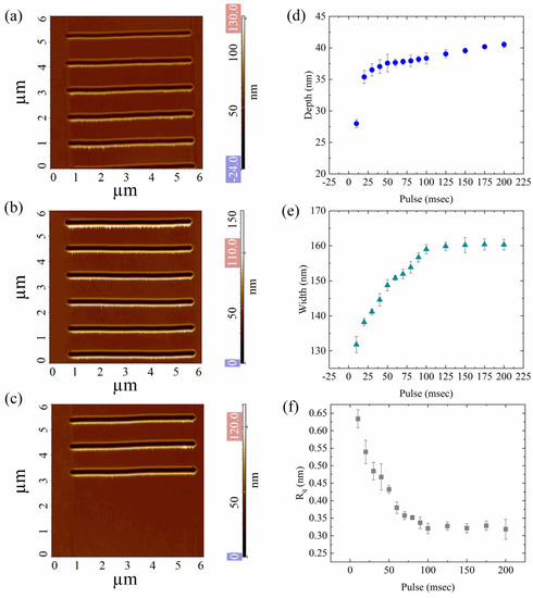 The grooves appear well-patterned and surrounded by pileups (Figure 5a–c) as already observed [49]. As performed in the previous sections, the impact of pulse width on the nanolithography results in terms of d, w, and Rq was estimated by randomly measuring twenty cross-sections along the nanogrooves’ AFM images; the d, w, and Rq mean values were then plotted as a function of pulse width (Figure 5d–f, respectively).