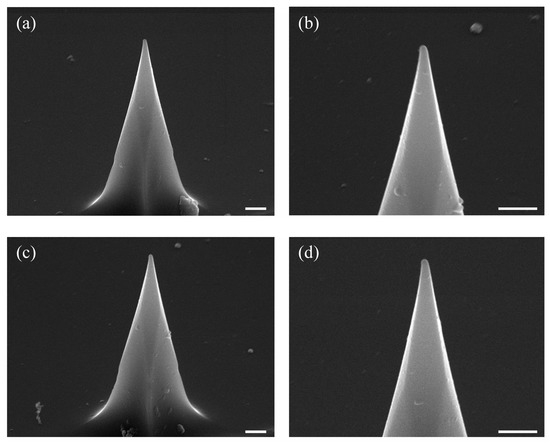 SEM images of (a,b) a new DCP20 probe and (c,d) the same probe used for P-AFL tests; the scale bars in the SEM figure correspond to 1 µm.