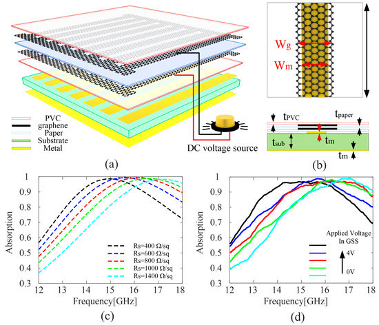 - Zhang, J.; Liu, Z.; Lu, W.; Chen, H.; Wu, B.; Liu, Q. A low profile tunable microwave absorber based on graphene sandwich structure and high impedance surface. Int. J. RF Microw. Comput. Eng. 2019, 30, e22022. [Google Scholar] [CrossRef]