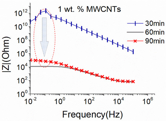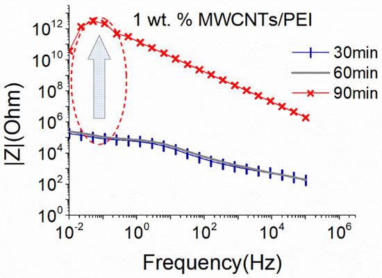 Thus, Figure 6 presents the effect of PEI addition in MWCNTs dispersions above the percolation threshold using the big sonication probe. As observed, the addition of PEI contributes positively to the dispersion of 1 wt.% MWCNTs, since obtained |Z| magnitude was quite low (app. 105 Ohm at 0.01 Hz) after 30 min of sonication, while the conductive behavior was maintained for up to 60 min of the process. A sharp increase (approximately seven orders of magnitude) of the |Z| values up to the limits of the measurement set-up was observed after 90 min, indicating a degradation of the CNTs structure. It can be suggested that the macromolecules of PEI are dispersed between the individual CNTs, supporting their separation. The dispersion ability of the MWCNTs during the presence of PEI with 2 wt. % is presented in the supplementary material section in Figure S10.