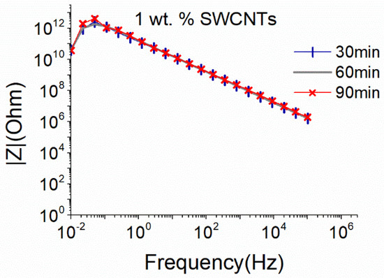 In Figure 1, the EIS plot of 1 wt.% MWCNTs dispersions at an intermediate sonication amplitude (i.e., 50%), using the small sonication probe, is presented. As aforementioned, this content was expected to be above the percolation threshold, and appropriate sonication should result in the creation of a conductive suspension. As observed in Figure 1, the Impedance |Z| presented very high values during the first 30 min of the sonication process, which for the low frequencies of the diagram are considered unreal as they are within the set-up measurement limits. Furthermore, the formation of a conductive network, demonstrated by a drop of the impedance |Z| by eight orders, was achieved after 60 min of ultrasonication. After 90 min, the dispersion remained conductive with a slight increase (one order of magnitude) in the |Z| value, which suggests a slight deterioration in the CNT structure due to extensive sonication.