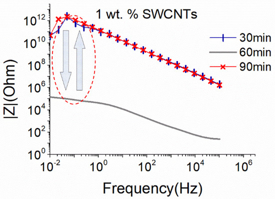 PEI is also used to convert SWCNTs from p-type to n-type, and its effect on the dispersive ability of solutions with 1 wt.% SWCNTs is shown in Figure 7. Again, a conductive network formed after 60 min of sonication. However, compared to the results obtained without the addition of PEI (Figure 4), |Z| values are over one order of magnitude higher here. This slight increase in |Z| could be linked to a viscosity increase in the prepared solutions due to the presence of PEI. Interestingly, additional sonication time (90 min) resulted in an improvement of the |Z|, leading to similar levels as those achieved after 60 min of sonication in the absence of PEI (see Figure 4). Furthermore, the deterioration of the CNT structure after 90 min of sonication of solutions without PEI (Figure 4) is not observed here. Based on the above, it can be deduced that the addition of PEI not only facilitates the dispersion process but also protects the SWCNTs from excessive breakage during sonication.