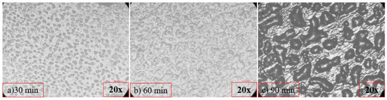 This detection of the degradation of the CNTs structure by EIS was verified by (Optical Microscopy). In Figure 5, the images of the optical microscope (20×) of the dispersion of 1 wt.% SWCNTs are presented. After 30 min of the sonication process (Figure 5a), the network was not formed as the presence of aggregates was remarkable. After 60 min (Figure 5b), a homogenized distribution was observed, followed by a reappearance of aggregates (re-agglomeration) after 90 min (Figure 5c) of the sonication process. This re-agglomeration can justify the increase in |Ζ| as the conductive network is clearly disrupted.