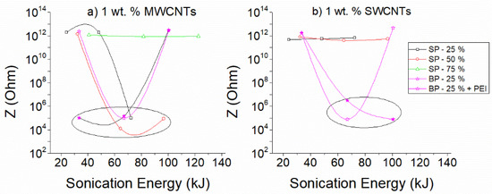 Variation of |Z| values at a frequency of 0.05 Hz as a function of sonication energy of aqueous dispersions of (a) MWCNTs 1 wt.% and (b) SWCNTs 1 wt.%. Note that SP stands for small and BP for big probe; P stands for PEI.