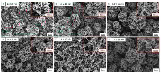 FE-SEM images of PEDOT films for different electropolymerization conditions, at (A) 1.3 V for 5 min, (B) 1.3 V for 10 min, (C) 1.3 V for 15 min, (D) 1.4 V for 5 min, (E) 1.4 V for 10 min, and (F) 1.4 V for 15 min.