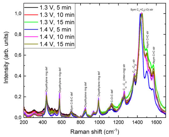 Raman spectra of the PEDOT films grown by electropolymerization under different oxidation potentials, i.e., 1.3 and 1.4 V, and electropolymerization times, i.e., 5, 10, and 15 min. Raman spectra were normalized to the band corresponding to the symmetric Cα = Cβ (-O) stretching at 1445 cm−1.