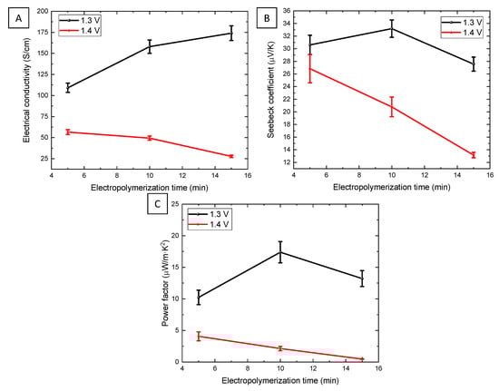 The Seebeck coefficients were positive in all the films measured, showing that PEDOT is a p-type semiconductor (see Figure 4B). This magnitude decreased as the deposition time increased, except for the film grown at 1.4 V for 5 min. The Seebeck coefficients for the films grown at 1.3 V were found to be 31 ± 2, 33 ± 1, and 28 ± 1 µV/K for 5, 10, and 15 min, respectively. The values of this magnitude for the films deposited at 1.4 V were 27 ± 2, 21 ± 2, and 13 ± 4 µV/K for 5, 10, and 15 min, respectively. Finally, the Seebeck coefficient was higher for films deposited at 1.3 volts, with the highest value discovered in films deposited for 10 min. The Seebeck coefficients found in the literature for films grown under similar conditions (acetonitrile, lithium perchlorate, and electropolymerization) were 9 µV/K [11] and 18.9 µV/K [12]. The PEDOT film grown in this work with the highest Seebeck coefficient exhibits a value 1.8 times higher than the highest reported.