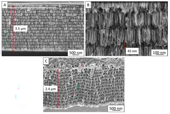 To determine whether better-controlled nanostructuration and a controlled porosity confer an improvement on the thermoelectric properties of PEDOT, the material was electropolymerized inside one 3D AAO template. This 3D AAO template was prepared according to our previous work [29,30,34,45,46,47,48,49,50,51]. For that, the electropolymerization potential of 1.3 V was chosen because it yielded the maximum power factor in films. An electropolymerization time of 2 h was used, resulting in a thickness of 3.5 μm, as observed in the FE-SEM images of Figure 6A. The number of transversal channels was 15.