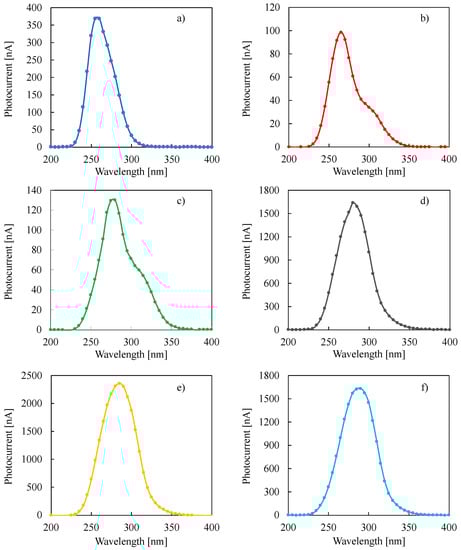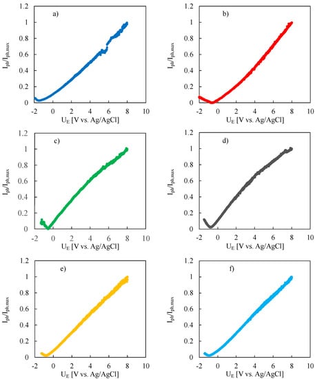 Iph vs. UE curves at constant irradiating photon wavelength (photocharacteristics) were recorded in order to study the dependence of photocurrent on the applied potential. Normalized photocharacteristics (Iph/Iph,max) at 260 nm (i.e., 4.76 eV) for all investigated oxides are shown in Figure 3.