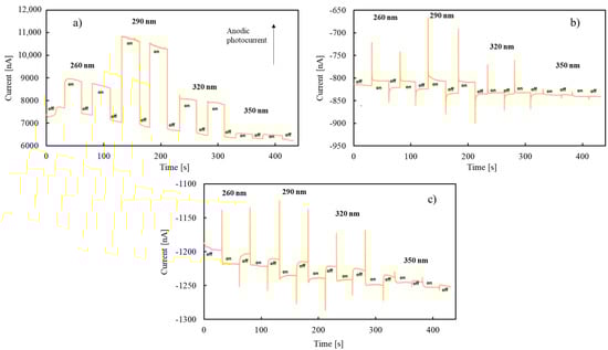 By sweeping the electrode potential from 8 V vs. Ag/AgCl in the cathodic direction, the measured anodic photocurrent decreased because of decreasing of the applied electric field across the anodic layer. Moreover, the photocurrent sign changed from anodic to cathodic (photocurrent phase angle not shown) for sufficient cathodic electrode potentials. This behaviour is typical of insulating materials, i.e., materials with Fermi level far enough from conduction/valence band edges, for which it is possible to generate both anodic and cathodic photocurrent depending on the direction of the applied electric field across the oxide film. The latter is directly related to the applied electrode potential and to its difference with respect to the flat band potential, UFB, of the material. Photocurrent sign inversion potential, Uinv, detected during photocharacteristics recording is expected to be close to the UFB value. However, a better and more reliable way to estimate the UFB value can be done by recording current transients with and without sample irradiation at different electrode potentials, as shown in Figure 4 where current vs. time curves are reported for the anodic oxide grown on Ta-85at%Nb to 50 V at three different electrode potentials, i.e., 8 V, −0.4 V and −0.5 V vs. Ag/AgCl, at λ = 260, 290, 320 and 350 nm.
