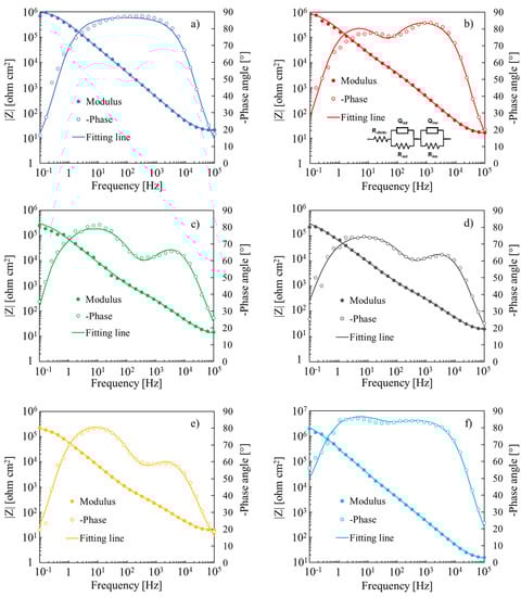 In Figure 5a–f, the electrochemical impedance spectra (EIS) relating to all the investigated 50 V anodic oxides recorded at 8 V vs. Ag/AgCl are shown. In order to fit the experimental impedance spectra by properly modeling the electrochemical behaviour of the metal/anodic layer/electrolyte systems, the equivalent electrical circuit (EEC) shown in the inset of Figure 5b was used.