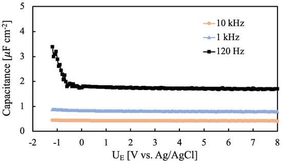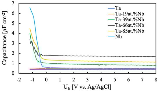Estimating the capacitance of the anodic layer at 120 Hz is particularly important since usually the commercial capacitor’s performance indicators (e.g., capacitance, ripple current) are evaluated at this frequency. It is interesting to note that anodic oxides became more polarizable approaching flat band potential value by increasing Nb content in the film. The highest measured capacitance, evaluated under high-band-bending conditions (i.e., at 8 V vs. Ag/AgCl), was measured for the anodic oxide grown on Ta-66at%Nb alloy, 1.7 µF cm−2. This value is more than four times higher than that measured for the anodic oxide on Ta and more than three times higher than that measured for the anodic oxide on Nb. It is worth mentioning that this capacitance value is also about three times higher than that of the anodic oxide grown in NaOH solution [].