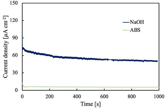 Leakage current measurement for the anodic oxides grown on Ta-66at%Nb alloy in NaOH and ABS solutions at 50 V by applying 37.5 V for 1000 s.