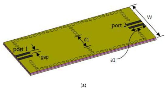Figure 1a shows a 3D image of the designed second-order SIW filter. The dimensions of the filter were arrived at by following the procedure in [,], where it can be seen that the width of the structure is proportional to the center frequency; hence, by changing W, the width of the resonator, the operational center frequency of the filter can be changed. The magnetic iris of length d1, according to the procedure in [], provides the coupling between the two resonators. The external quality factor can be determined by varying distance a1 and gap, as shown in Figure 1b.