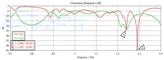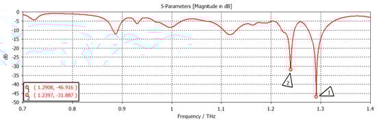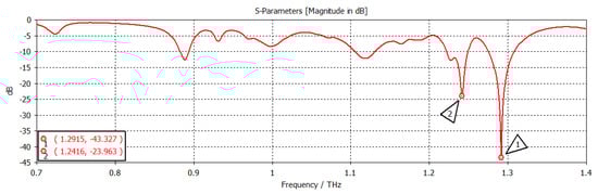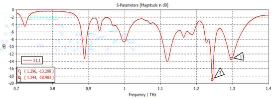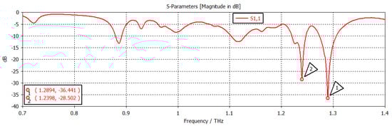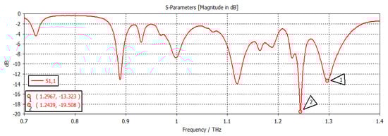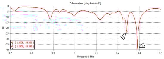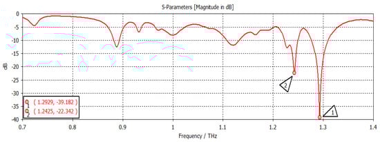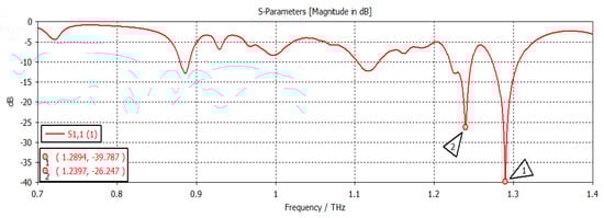 The chemical potential was kept constant at 0.1 eV. The parameters w1, representing the width, and z1, representing the length of the graphene patch, were changed, and the results are shown in Figure 11. When w1 = 50 µm and z1 = 100 µm, as shown in Figure 11, the first and second frequencies were 1.2908 THz with a return loss of −46.9 dB and 1.2397 THz with a return loss of −31 dB, respectively. When the length was only changed to 300 µm, keeping w1 constant, as indicated in Figure 12, the frequency of operation changed to 1.2915 THz with a return loss of −43.327 dB, while the second frequency became 1.2416 THz with a return loss of −23.963 dB. When both w1 and z1 were changed to 100 µm and 300 µm, respectively (Figure 13), the first and second frequencies changed to 1.2929 THz and 1.2425 THz, respectively, while the return losses were −39.182 dB and −22.342 dB, respectively. Finally, in this experiment, the width and length were set at 150 µm and 100 µm, respectively, and the first and second frequencies, as indicated in Figure 14, changed to 1.2908 THz and 1.2408 THz, respectively. At the same time, the return losses were −38.426 dB and −23.348 dB, respectively.