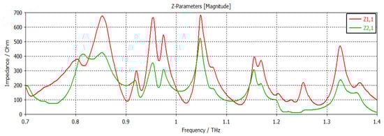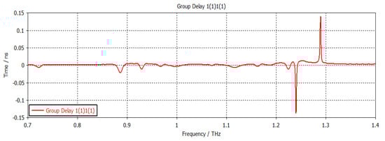 The structure was simulated at first with no graphene, as shown in Figure 2. This graph shows the return loss and insertion loss of the filter device. The SIW filter parameters are given in Table 1. It can be seen that the filter operated at a frequency of 1.2902 THz with a return loss of −44 dB. The group delay is shown in Figure 3. It can be seen that a group delay of less than 1.15 ns occurred at the edge of the passband. From the results, we can see that the group delay was very small, which is desirable; otherwise, a higher group delay will distort the waveform of the signals, resulting in unreliable communication. The surface current of the filter is shown in Figure 4. With the current being directly proportional to the electric field, this confirmed the electric field variations on the graphene patch, showing that the fundamental mode was being passed from port 1 to port 2 with a strong electric field on the surface of the graphene patch. Figure 5 shows the impedance plot of the filter, which confirms the resonance of several modes in the structure. The modes were quite close to each other and they could bring about a wider bandwidth band-pass filter if they could be merged together.