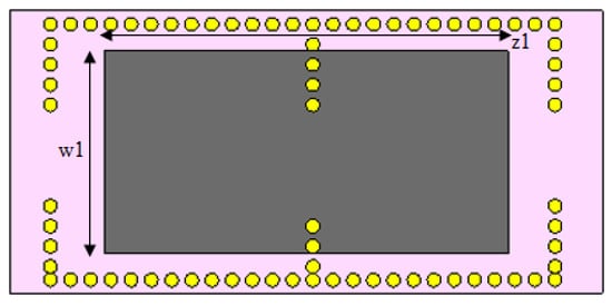 The length and width of graphene, as shown in Figure 10, were changed simultaneously, and the effect on the center frequency is presented here. The top layer of copper, as shown in Figure 1a, was removed to expose the graphene sheet, shown in Figure 10 as the grey patch with dimensions w1 and z1. Here, yellow circles represent the via holes.