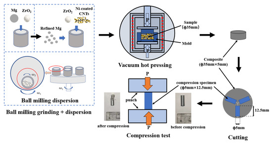 The raw material used in the experiment were atomized magnesium powder (spherical diameter 20 μm; Yaotian new material Co., Ltd., Shanghai, China) and nickel-coated CNTs (outer diameter 30–50 nm, length < 10 μm, Ni content > 60 wt%, CNT content > 38 wt%; Jiacai Technology Co., Ltd., Chengdu, China). The preparation process of the CNT/Mg composite was divided into three steps—the grinding of the magnesium powder, the dispersion of CNTs by ball milling, and sintering by vacuum hot pressing, as shown in Figure 1. Most of the experimental operation processes, such as the powder loading, should be carried out in a glove box as far as possible to isolate the air and avoid the oxidation of the magnesium powder. In the process of magnesium powder grinding, the original magnesium powder and zirconia balls were put into sealed tanks and the ball milling was carried out for 60 h at a speed of 200 rpm in a planetary ball mill. In this process, a mass fraction of 5% stearic acid was added as the control agent, according to a rate of 1 wt.% per 12 h. The ball-to-material ratio was 10:1. In the process of dispersing the CNTs by ball milling, the ground magnesium powder, nickel-coated CNTs, and zirconia balls were added to the sealed tank under ball milling at 225 rpm for two hours. The ball-to-material ratio was the same as that of the grinding process. This composite powder was then placed in a graphite mold with an inner diameter of 35 mm. Cylindrical composites were prepared by sintering in a vacuum hot-pressing furnace (HP8-6-8GGD6A4A22, Centorr Vacuum Industries, Nashua, NH, USA). The sintering temperature was 550 °C and the holding time was 30 min. The air pressure was less than 5 Pa in the furnace. During the process of heating, the powder was heated to 400 °C at a rate of 10 °C per minute and stayed at this temperature for two hours, so that the stearic acid—the control agent mixed during ball milling process—was volatilized. Then, the powder was heated to 550 °C at the same rate and was held at this temperature for half an hour. Then, the sintered sample was cooled in the furnace.