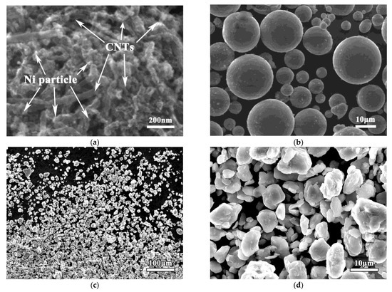 Figure 2a shows the morphology of the as-received nickel-coated CNTs. After the chemical modification by nickel plating, there were many small Ni particles measuring less than 50 nm on the surfaces of the CNTs. This allowed the CNTs to bind more easily to the Mg matrix. Figure 2b shows the morphology of the as-received pure magnesium powder. The original atomized magnesium powder was a standard spherical shape. Its average diameter was about 20 μm. To reduce its size, the magnesium powder was ground by ball milling for 60 h. Its micromorphology after grinding is shown in Figure 2c,d. After a long period of grinding, the magnesium particles changed from a standard spherical to irregular lumpy shape. The particle size was also significantly reduced to about 3 μm. These particles were composed of many small broken magnesium particles welded together. This was due to the impact and friction [23] from ball milling for a long time, which meant the magnesium powder was periodically broken, inlaid, and welded. Due to the existence of the control agent during ball milling, the magnesium particles could not easily aggregate and grow, but mainly showed a tendency for grinding and refining.
